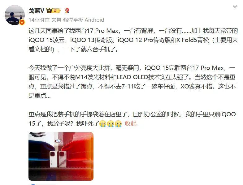 这几天同事给了我两台17 Pro Max,一台有背屏,一台没有……加上我每天常带的iQOO 15凌云、iQOO 13传奇版、iQOO 12 Pro传奇版和X Fold5青松(主要用来看文档的),一下子就六台手机了。