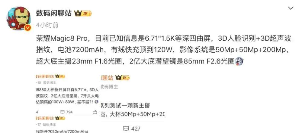 相关的爆料显示,荣耀Magic8 Pro将配备6.71\"1.5K等深四曲屏,支持3D人脸识别和3D超声波指纹,电池7200mAh,有线快充120W,影像系统是50Mp+50Mp+200Mp,超大底主摄23mm F1.6光圈,2亿大底潜望镜是85mm F2.6光圈。