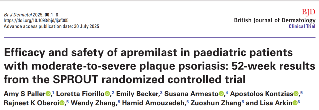 [1]Paller A S, Fiorillo L, Becker E, et al. Efficacy and safety of apremilast in paediatric patients with moderate-to-severe plaque psoriasis: 52-week results from the SPROUT randomized controlled trial[J]. British Journal of Dermatology, 2025: ljaf305.