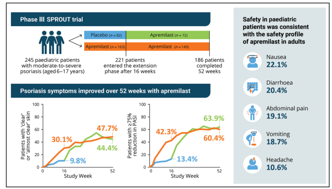 SPROUT研究(NCT03701763)是一项Ⅲ期多中心、随机、双盲、安慰剂对照试验,旨在评估阿普米司特在6-17岁中重度斑块型银屑病患儿中的疗效与安全性。研究纳入符合PASI≥12、BSA≥10%且sPGA≥3标准,且对局部治疗反应不足或不适宜的患者。